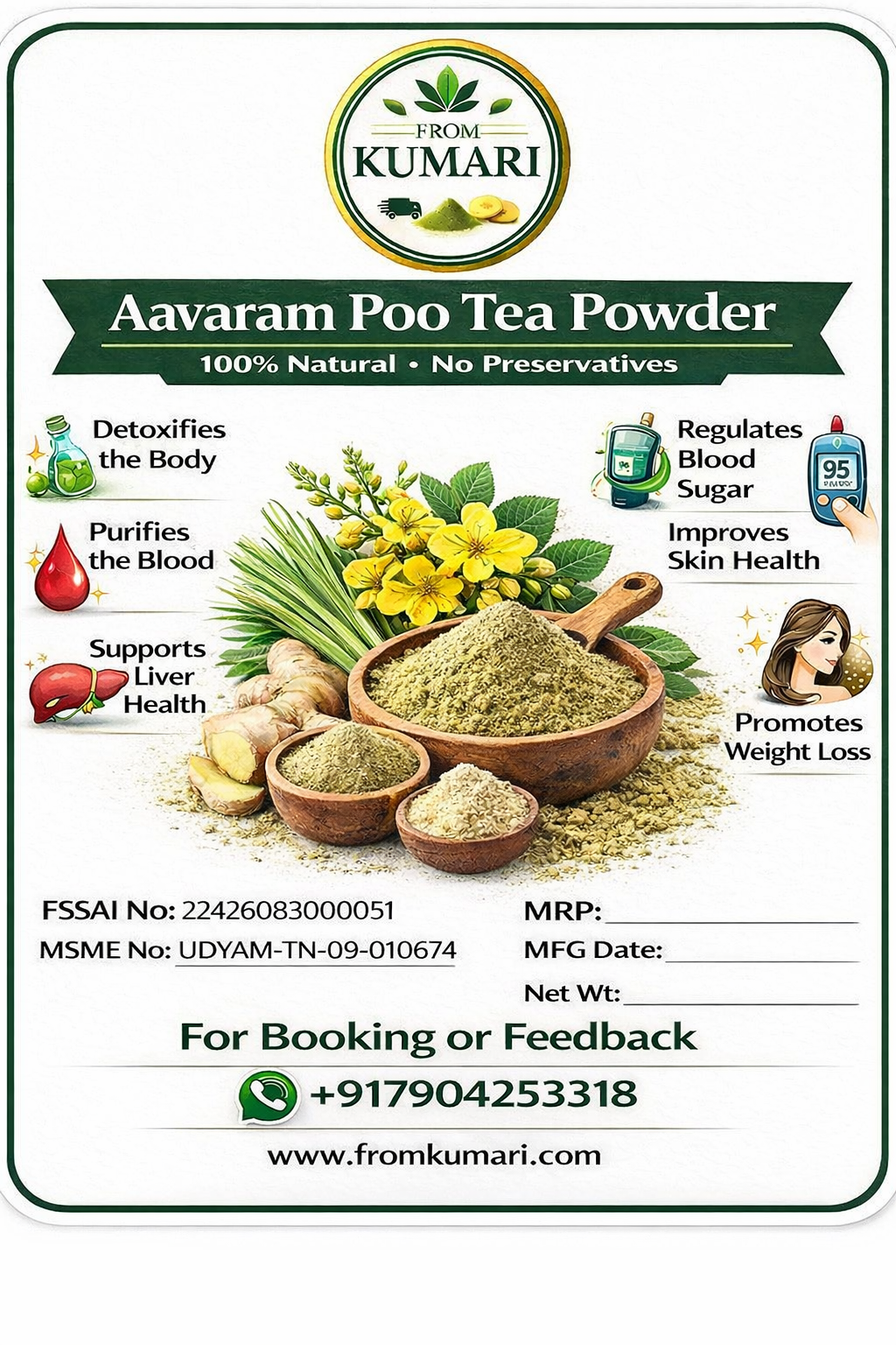 Aavaram Poo Tea Powder, Herbal Tea for Glowing Skin, Caffeine-free Wellness Tea, Avarampoo with Amla and Ginger, Natural Blood Sugar Control Tea, Traditional Tamil Herbal Tea, Kanyakumari Farm Products, From Kumari Herbal Mix.