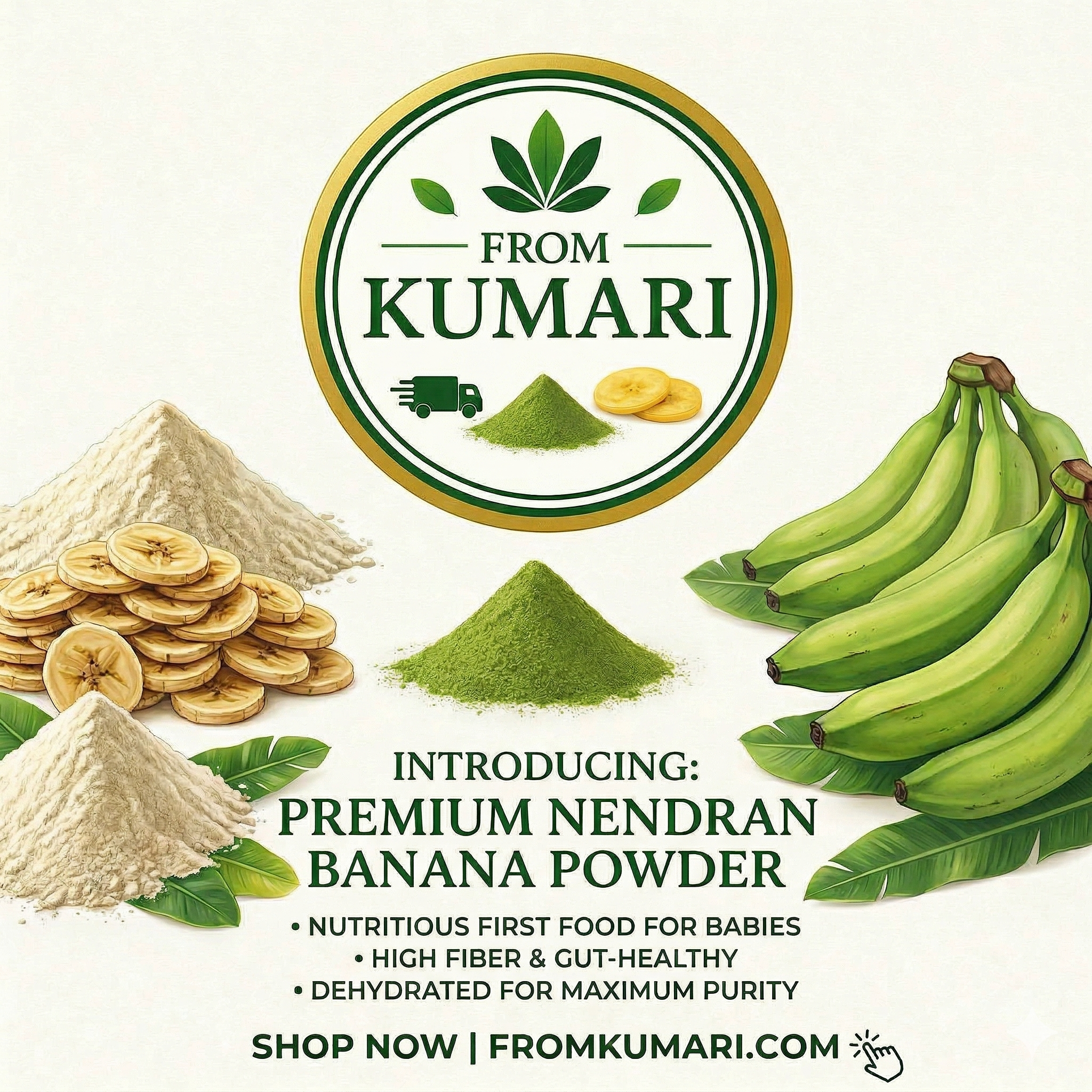 “Discover the traditional goodness of Kanyakumari’s finest Nendran bananas. At From Kumari, we use an advanced dehydration process to transform raw, premium Nendran bananas into a nutrient-rich, fine powder while retaining 100% of their natural vitamins and minerals.